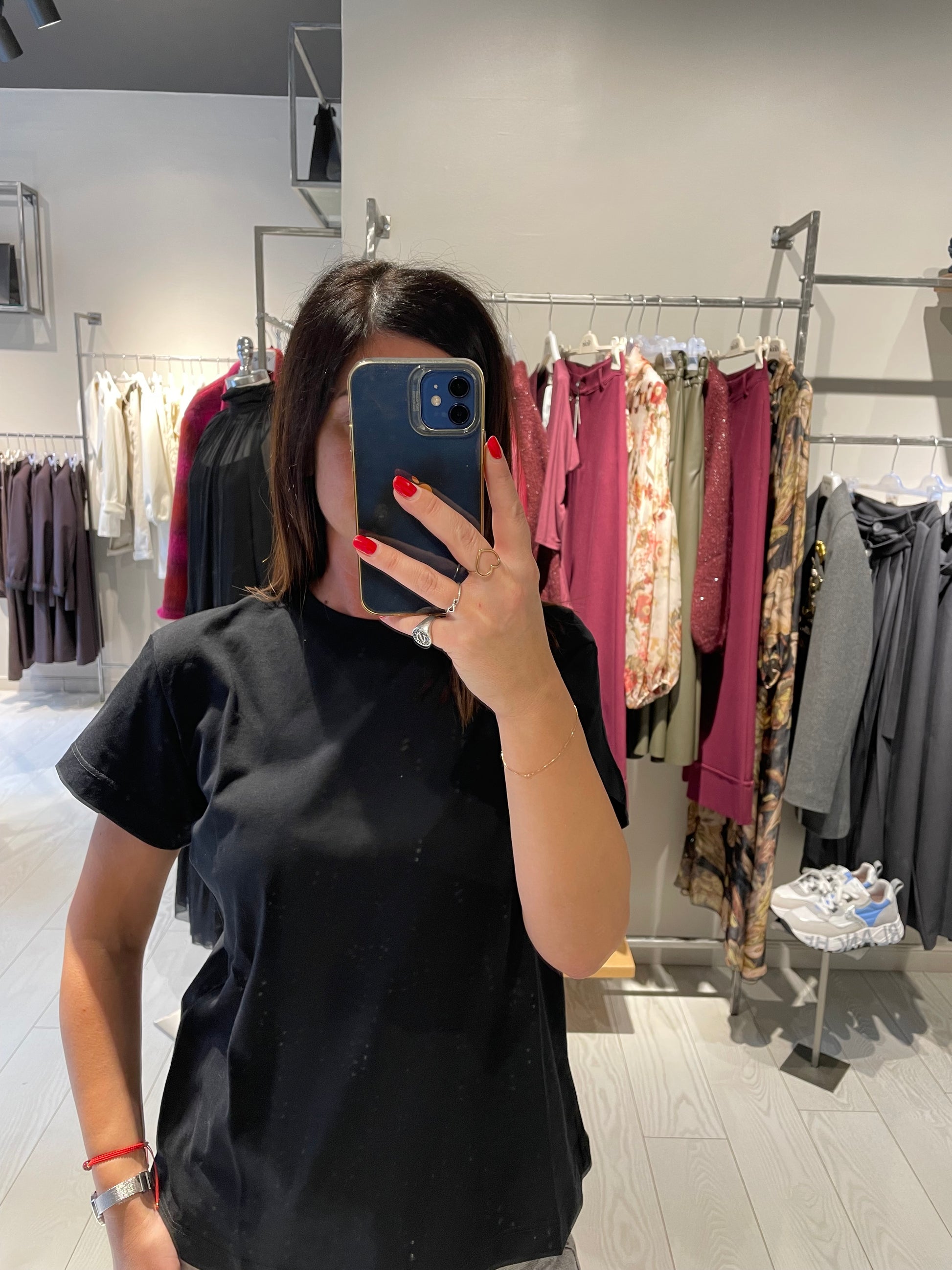 T-SHIRT girocollo modello a scatoletta, capo disponibile in taglia unica che veste fino ad una L, la modella è nalta 1,68 m circa